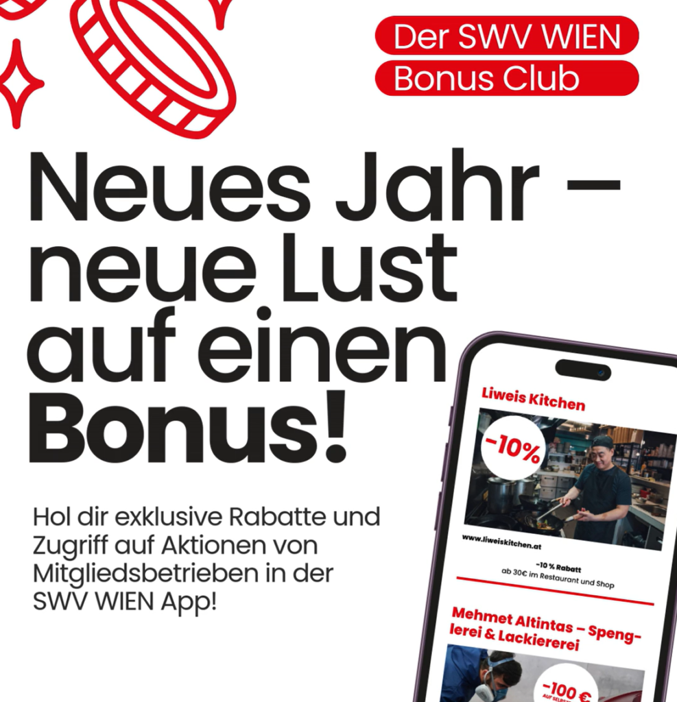 Im Herbst lag der Fokus verstärkt auf neuen Services für unsere Mitglieder. Im November startete der SWV WIEN Bonusclub in der vollständig neu überarbeiteten App. Seither profitieren Mitglieder von einzigartigen Vorteilen und attraktiven Rabatten bei anderen Verbandsmitgliedern sei es bei Einkäufen, Dienstleistungen oder Abos. Ein exklusiver Club für SWV Mitglieder, die sich gegenseitig unterstützen möchten.
