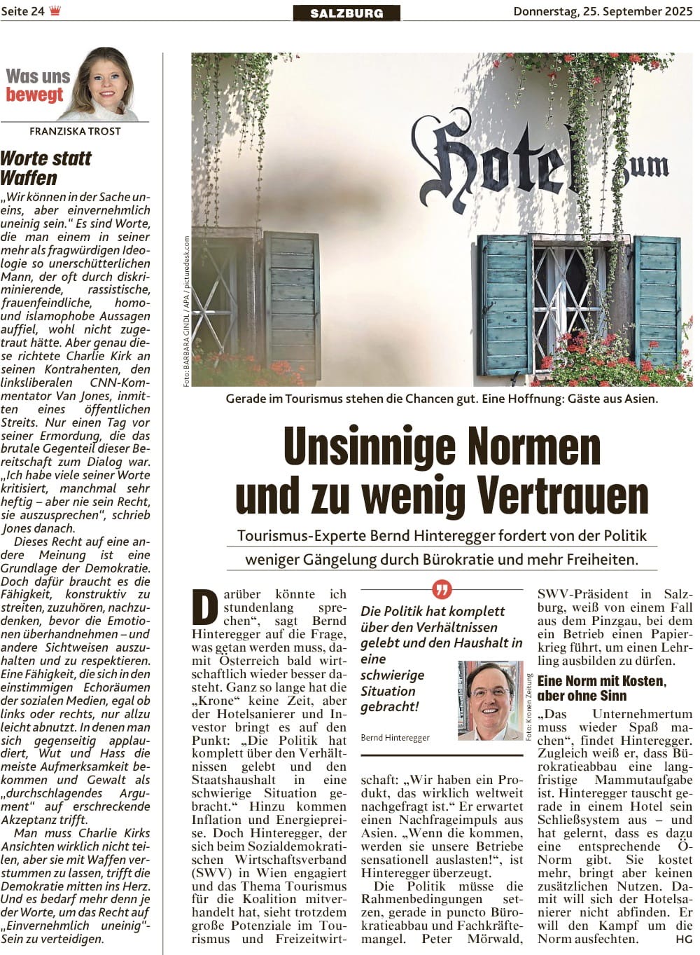 Danach ging es weiter nach Oberösterreich. Gemeinsam mit SWV OÖ Präsident Manfred Zaunbauer und Vizepräsidentin Carina Schmiedseder informierte Bernd die oberösterreichischen SWV Mitglieder über seine Pläne. In einem Interview mit den Oberösterreichischen Nachrichten sprachen Bernd und Manfred über die aktuellen Bürokratie- und Personalprobleme im heimischen Tourismus. Sie stellten mögliche Lösungsansätze vor und betonten die langfristigen Wachstumschancen für den Standort Österreich.